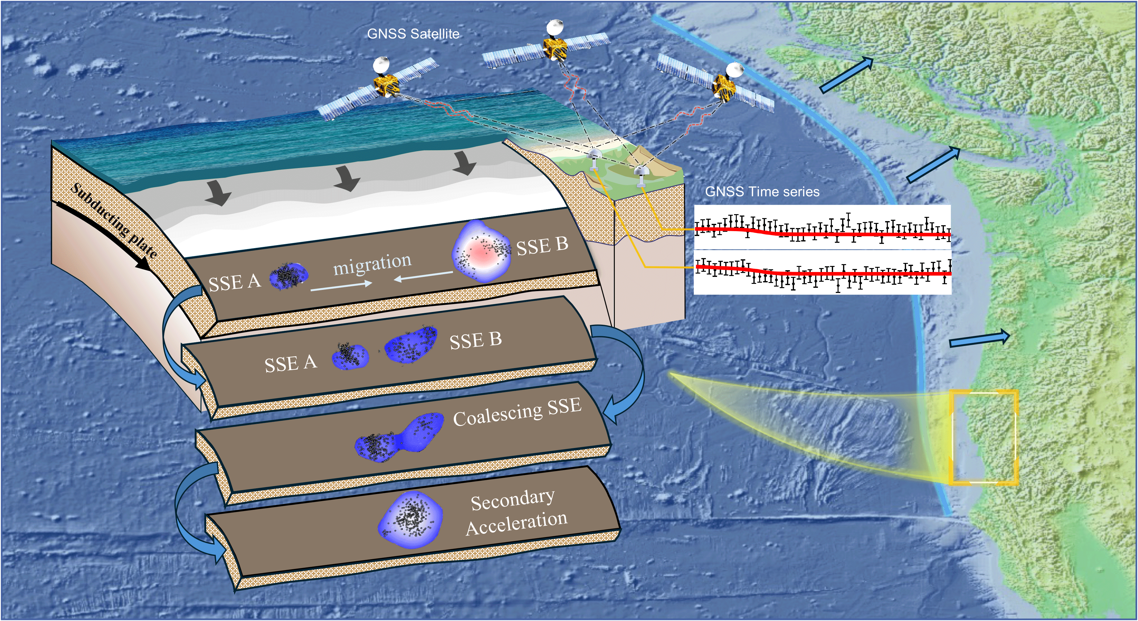 近日,南方科技大学地球与空间科学系陈克杰课题组在Nature Communications发表题为“Secondary acceleration of slip fronts driven by slow slip event coalescence in subduction zones”的研究论文。该研究基于240个全球导航卫星系统(GNSS)测站长达10余年的坐标位置时间序列,通过机器学习信号检测结合地球物理反演与数值模拟,系统揭示了北美卡斯卡迪亚俯冲带(Cascadia Subduction Zone)慢滑移事件(Slow Slip Events)合并过程及其对断层的应力影响,为理解慢滑移在地震周期中的作用提供了新视角。