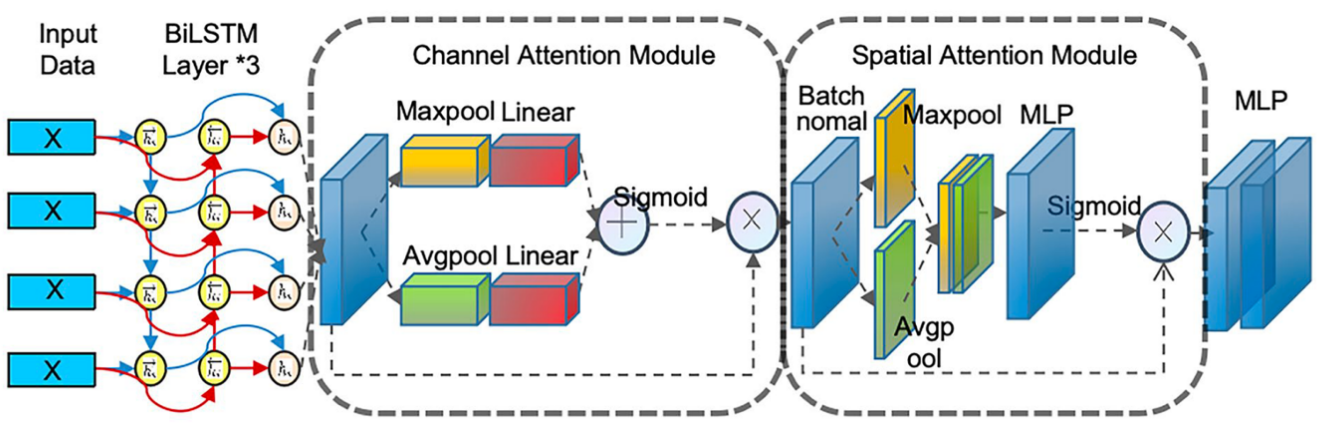 图1.深度学习网络结构示意图。模型由三层堆叠的双向LSTM、通道注意力与空间注意力模块组成,并通过Sigmoid层输出每个数据点的判别概率