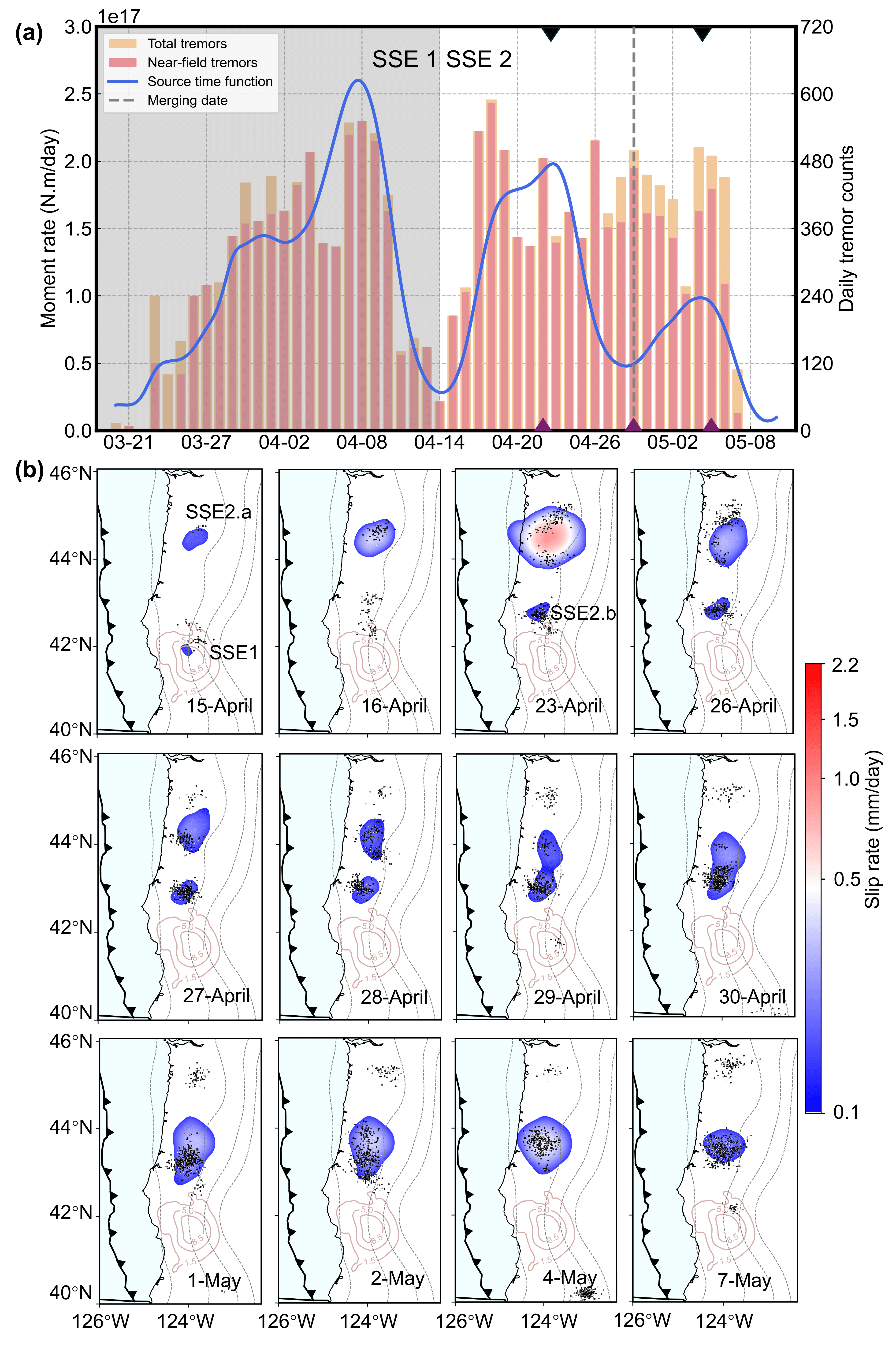 图2.2021年合并慢地震的地震矩率变化(a)和破裂演化快照(b)