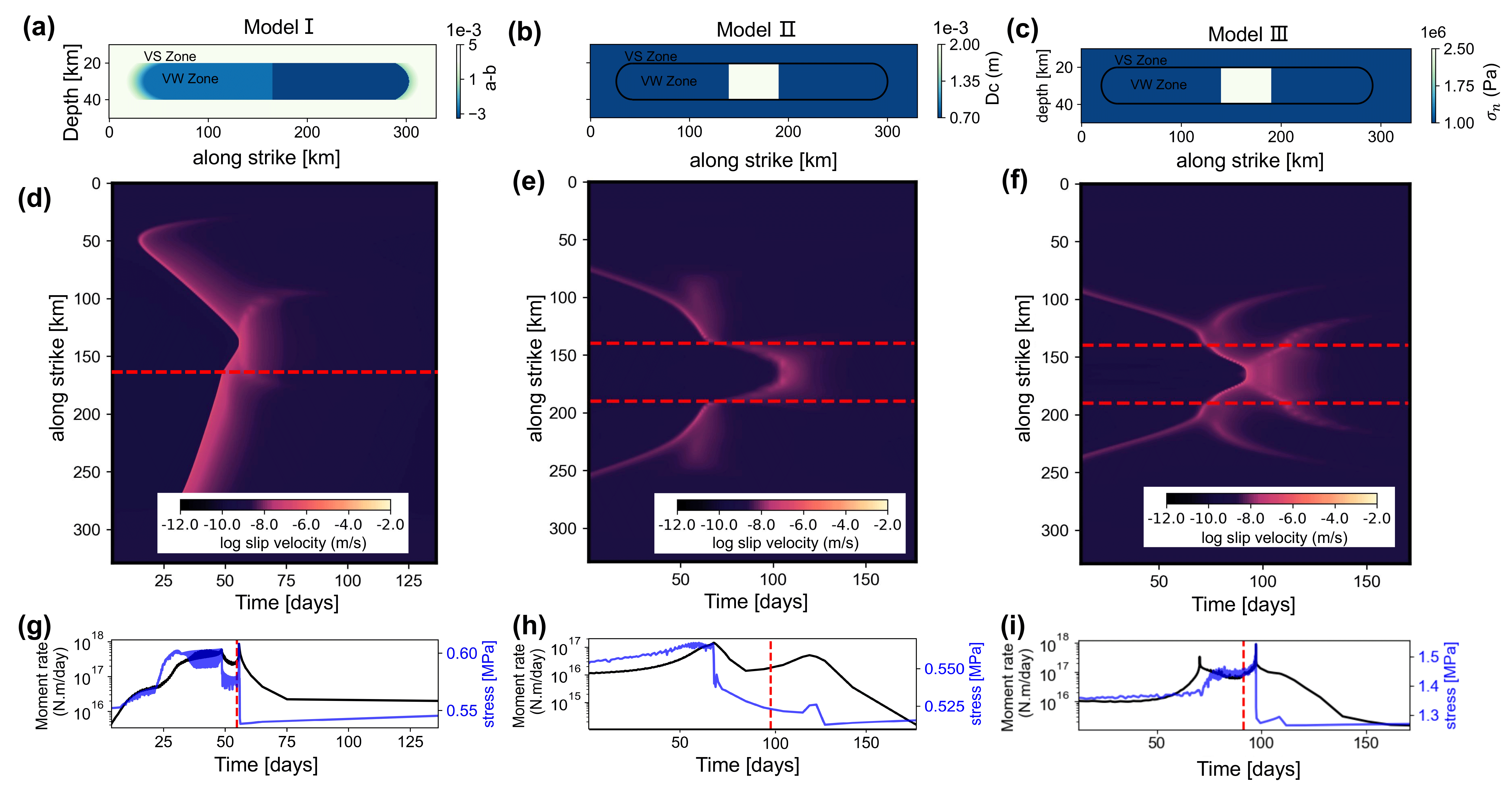 为深入探究慢滑移合并机制,基于QDYN平台,本研究建立了速率-状态摩擦模型,并引入断层界面沿走向的异质性(摩擦参数、特征滑移距离Dc和有效正应力σₙ)进行动力学数值模拟(图3)。模拟结果显示,即使在均匀模型中也会发生合并,但断层异质性会减缓传播速度并制造“障碍区”,从而导致南部区域的合并主要出现在减速阶段。Cascadia地区南部地质条件——例如Siletzia玄武岩体、Klamath山脉沉积物以及高压流体通道,可能是关键驱动因素。模拟结果还表明,二次加速的滞后时间(6-18天)与实测观测高度一致,验证了该机制的合理性。