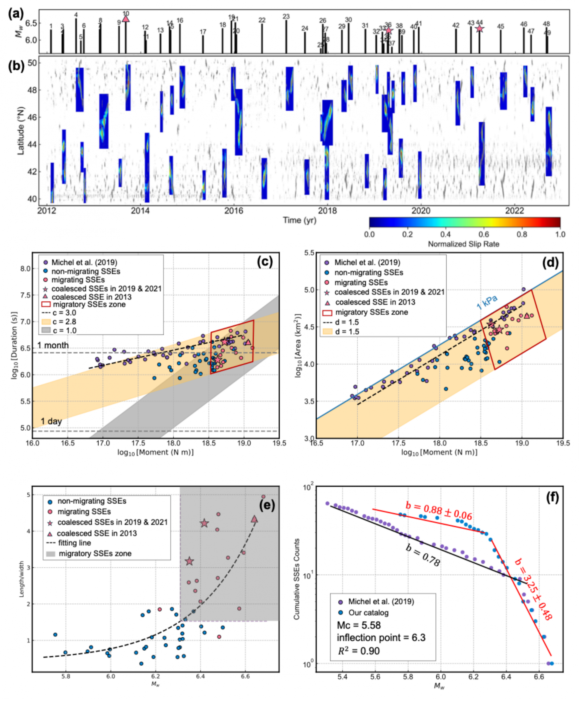 同时,研究还发现慢地震的震级—频率分布在Mw≈6.3附近存在明显“拐点”:小于6.3级的事件数量随震级增加缓慢减少,而超过6.3级后,事件数量则骤减,b值从0.88骤升至3.25。该变化与慢地震的“形态”有关,当破裂区域变得细长(长宽比超过1.65)时,事件往往表现出迁移或合并特征。