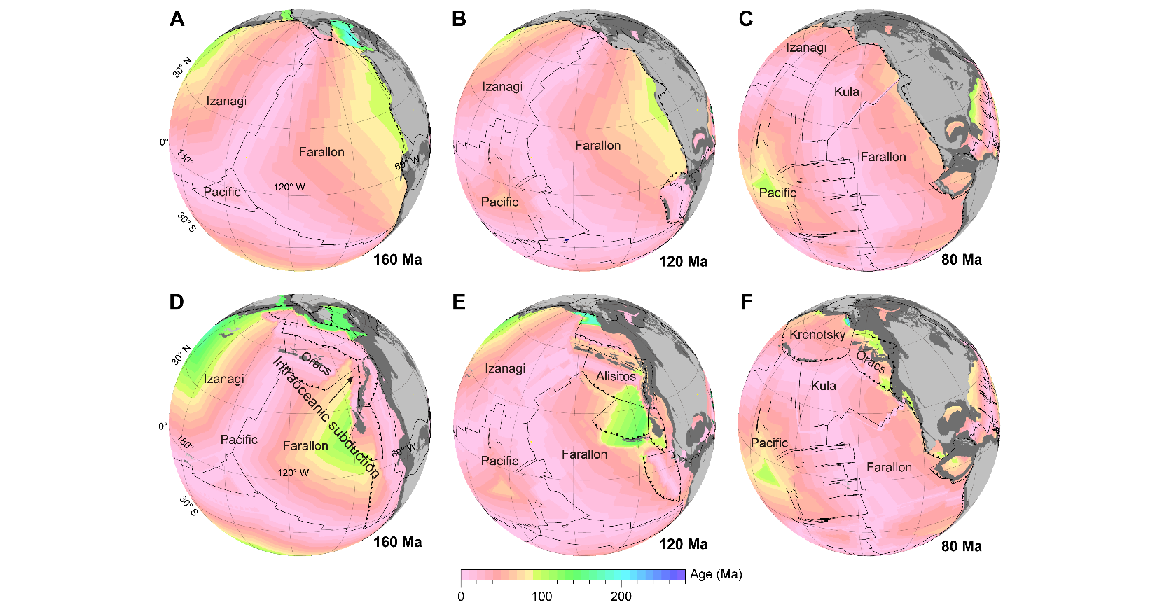 图2.传统的“安第斯”型板块重构(上)和包含东北太平洋洋内俯冲系统的板块重构(下)。