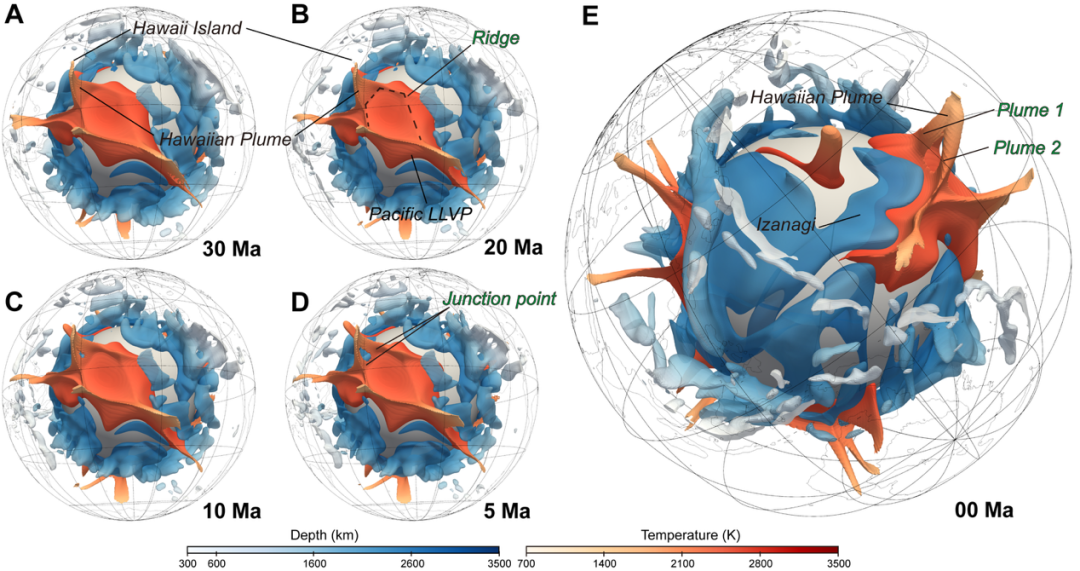 近日,南方科技大学地球与空间科学系副教授胡佳顺课题组在Science Advances发表题为“Bilateral Loa-Kea trends of the Hawaiian Islands caused by the bottom-up splitting of plume conduit”的研究论文。该研究基于包含板块运动数据同化的高分辨率全球地球动力学模拟,不仅成功再现了夏威夷地幔柱的空间位置与演化轨迹,还揭示了地幔柱内部结构演变与地表双侧地球化学分区的深部动力学机制。